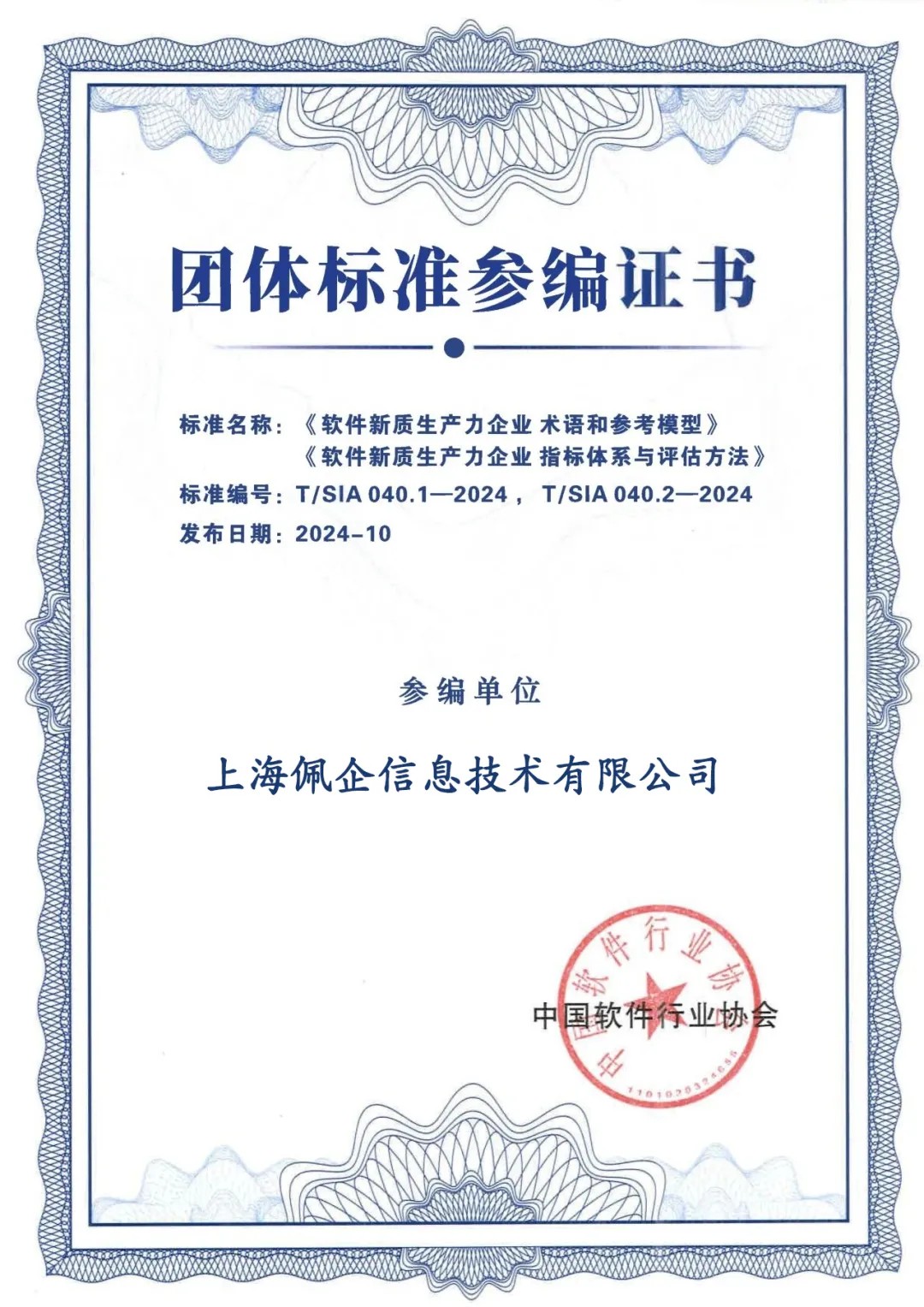 论坛期间,由佩企科技参与编写的《软件新质生产力企业》系列团体标准正式对外发布,佩企科技获得由中国软件行业协会颁发的“团体标准参编单位”证书。本标准体系涵盖软件新质生产力的定义、评价指标体系评估方法和工具、管理、技术、人才等要素指南、可持续发展指南以及数据要素规范等多个维度。