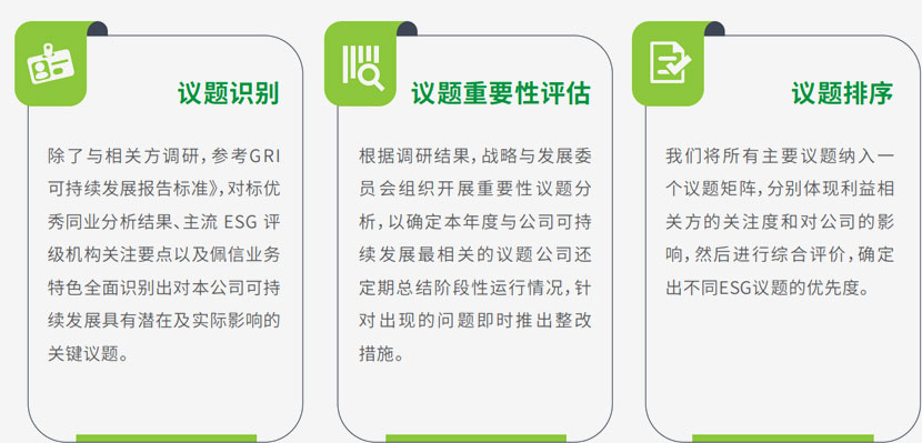 佩信集团持续开展ESG议题重要性评估,并将ESG议题全面融入集团运营管理工作,致力于将ESG理念全面且深入地融入集团的日常运营与管理工作中,以强化可持续发展战略的实践与管理。针对ESG重要性议题的识别与评估,佩信集团遵循以下系统而详尽的步骤。