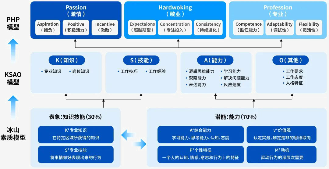 PHP模型以经典理论为根基,融合冰山模型、KSAO模型与ASK模型,形成涵盖知识、技能、态度、动机与价值观的“三维一体”评估框架。通过对21类理论中33个高频“动力项”的聚类分析,模型进一步提炼出135项可操作指标,系统覆盖人才“选、用、育、留”全周期,实现了从理论构想到精细化管理的落地。