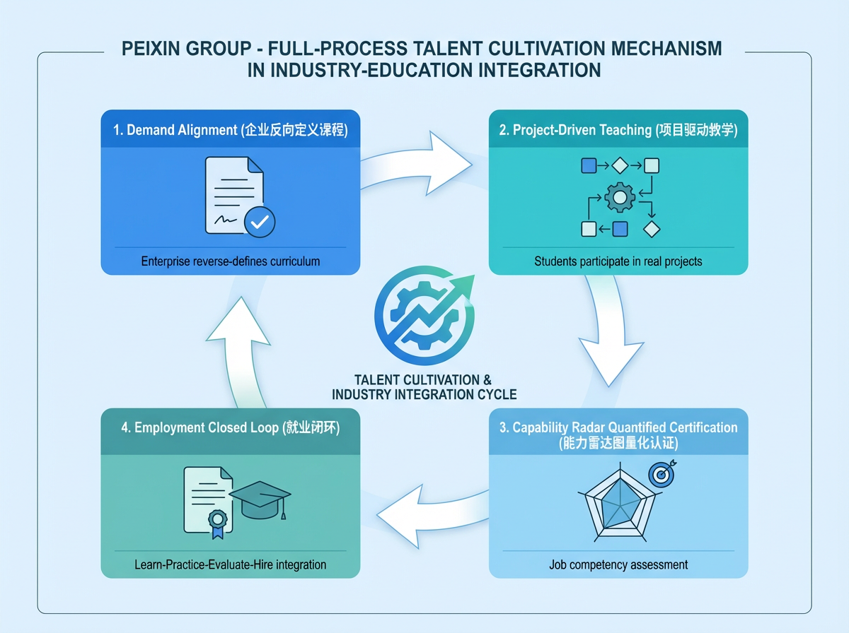 教育是“投资于人”的基础工程,佩信以“运营服务商”角色深度介入校企合作,推动产教融合从签约走向共生。我们联合多所应用型高校及行业头部企业共建“数字商业产业学院”,打造“需求对接—项目驱动—能力认证—就业闭环”的全流程育人机制: