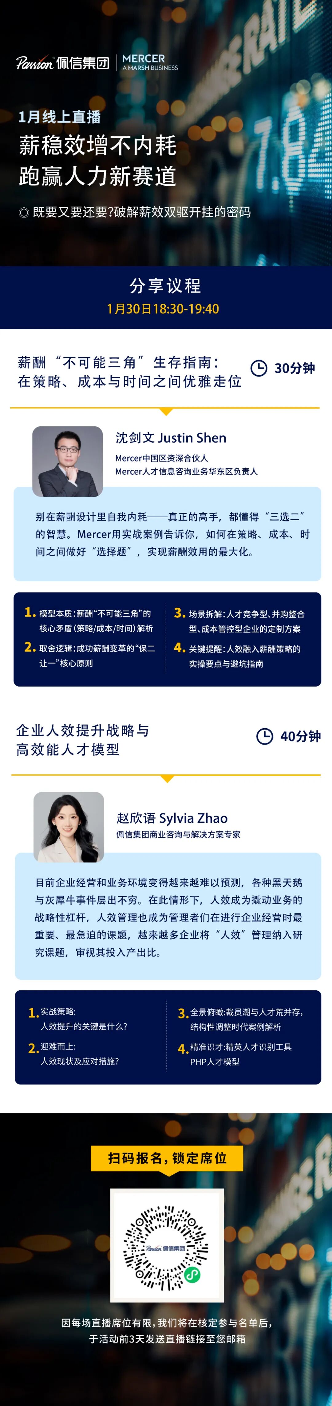 1月30日下午6:30,美世Mercer×佩信集团强强联手,携实战模型、标杆案例与落地工具,帮你把钱花对、把人用准、把增长做实。