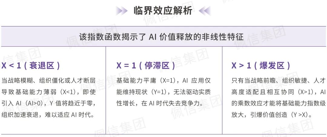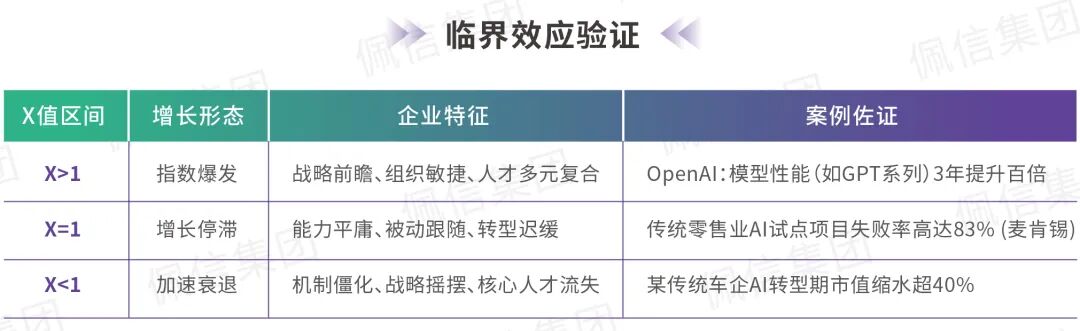 当X代表的企业基础能力(战略×组织×人才)系数X>1时,AI才能引爆指数级增长;若X≤1,即使引入AI也会加速衰退。这意味着AI时代的竞争,首先是管理基础的竞争。