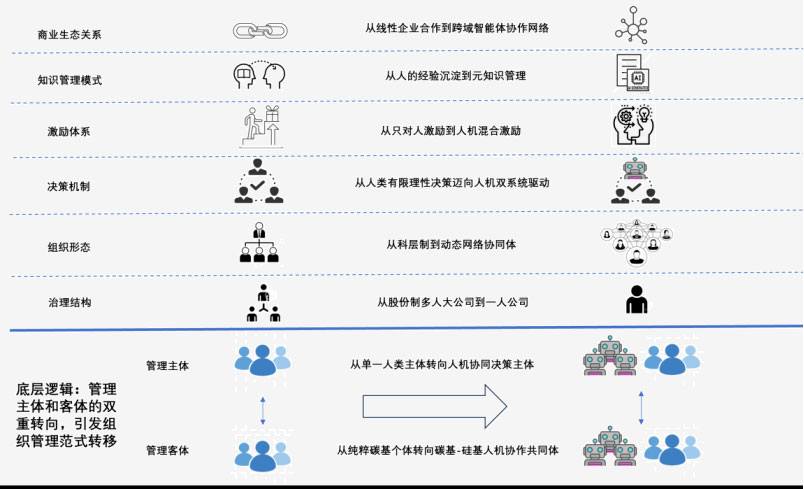 这意味着,人类与智能体不再局限于主客体的单一角色。两者既可作为管理主体参与决策,也能作为管理客体接受指挥。这种双重转向并非简单的概念延伸,而是将引发组织管理体系的系统性革新与重构,其深远变革体现在以下六个关键维度。