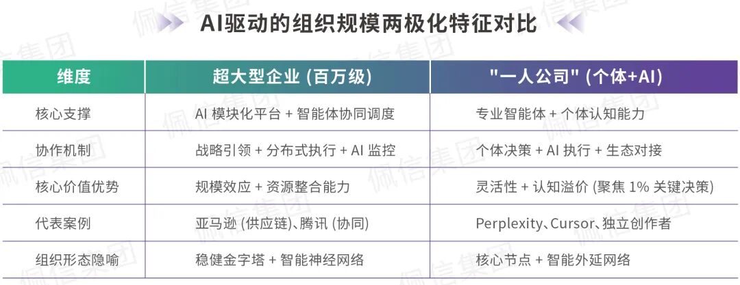 规模两极化:AI同时支撑超大型企业的高效协作与”一人公司“创业模式。亚马逊通过供应链算法优化,支撑全球百万级员工的协同效率;而AI搜索公司Perplexity估值超140亿美元,员工不足300人,依托AI实现”小团队高价值“。