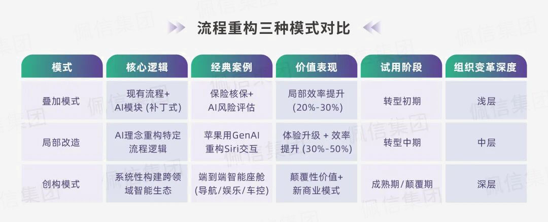 ·叠加模式:在现有流程中嵌入 AI 模块,提升局部效率。如保险公司在核保流程中叠加“AI 风险评估”,使核保时间从 3 小时缩短至 40 分钟。该模式成本低、见效快,但未触及流程本质,优势易被模仿。