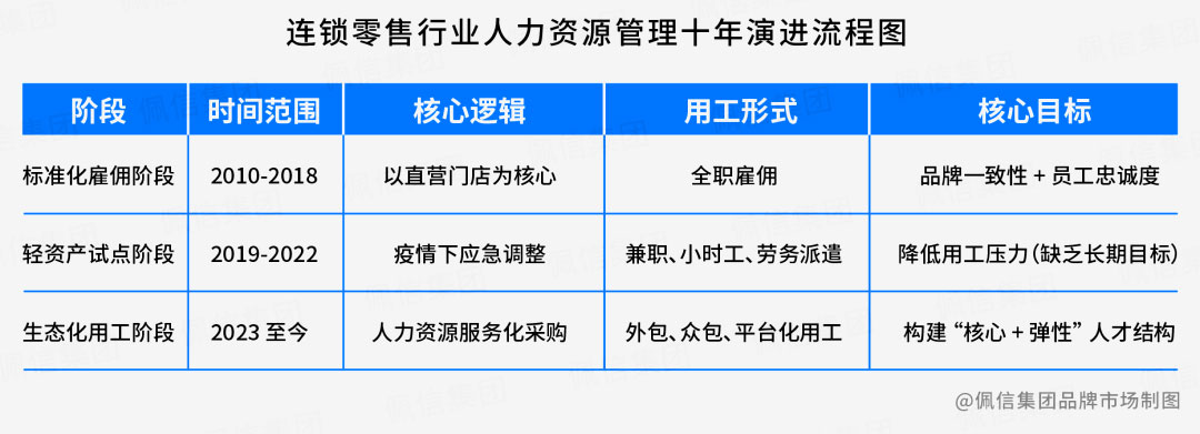 1. 标准化雇佣阶段(2010-2018):以直营门店为核心,强调统一培训、统一薪酬、统一晋升路径,追求品牌一致性与员工忠诚度。