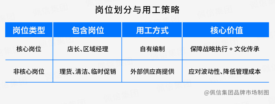 当前,领先企业已不再简单地将外包视为“降低成本的工具”,而是将其纳入整体人才战略:核心岗位(如店长、区域经理)保留自有编制,确保战略执行与文化传承;非核心、高重复性、强波动性的岗位(如理货、清洁、临时促销)则交由外部供应商按需提供。