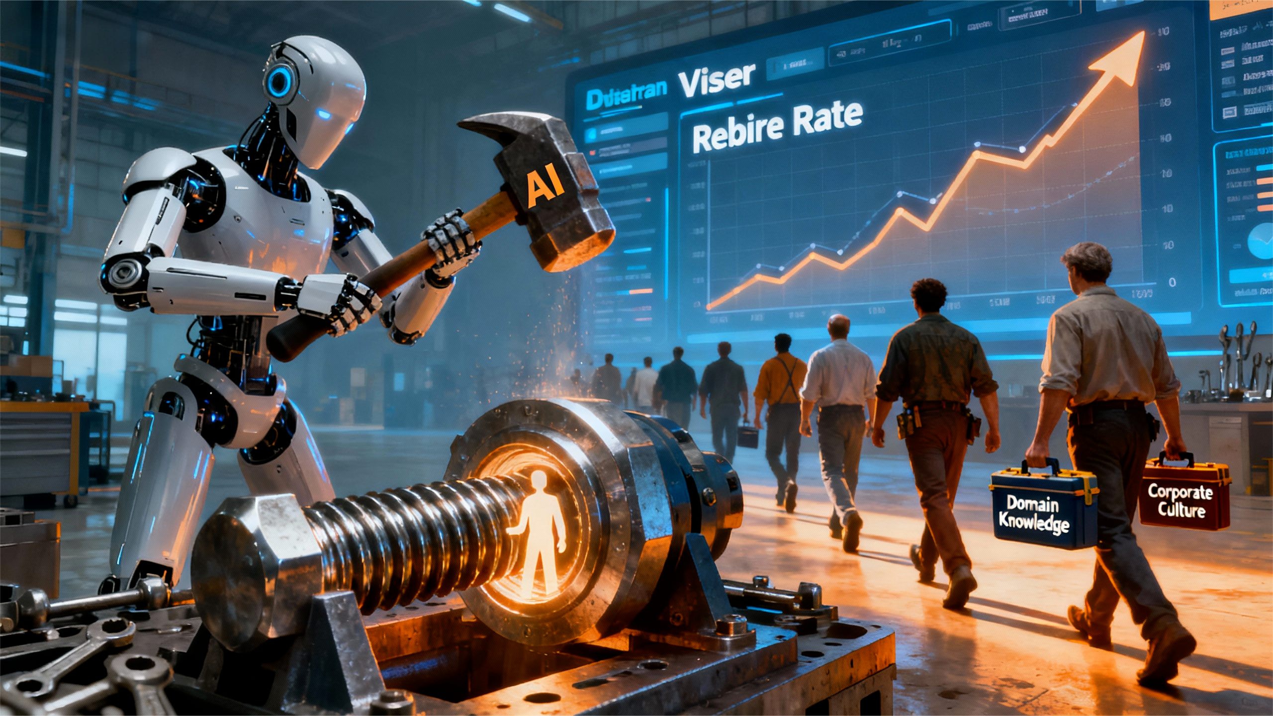人力数据平台Visier的报告揭示了一个关键转折:在其追踪的142家企业中,5.3%的被裁员工被原公司重新聘用,且这一比例近两年显著加速。这指向一个核心事实:许多企业过早地用AI这把“锤子”敲掉了本应保留的“螺丝”。