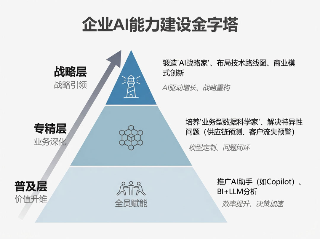 - 战略层:锻造能将AI趋势转化为商业模式、主导技术路线图的“AI战略家”。