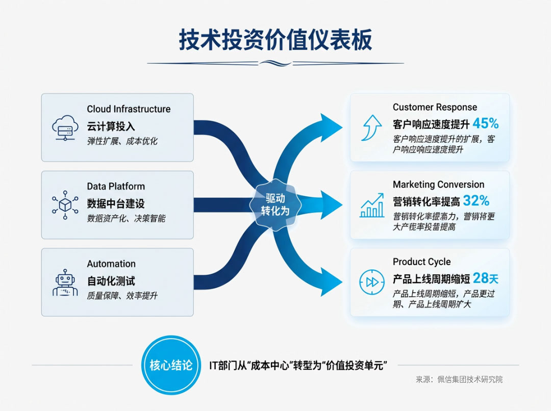 真正的成本优化,应是以业务成果为导向的技术资源配置机制。佩信集团积极推动企业建立“技术投资价值仪表板”,将每笔投入与可量化的业务产出挂钩。