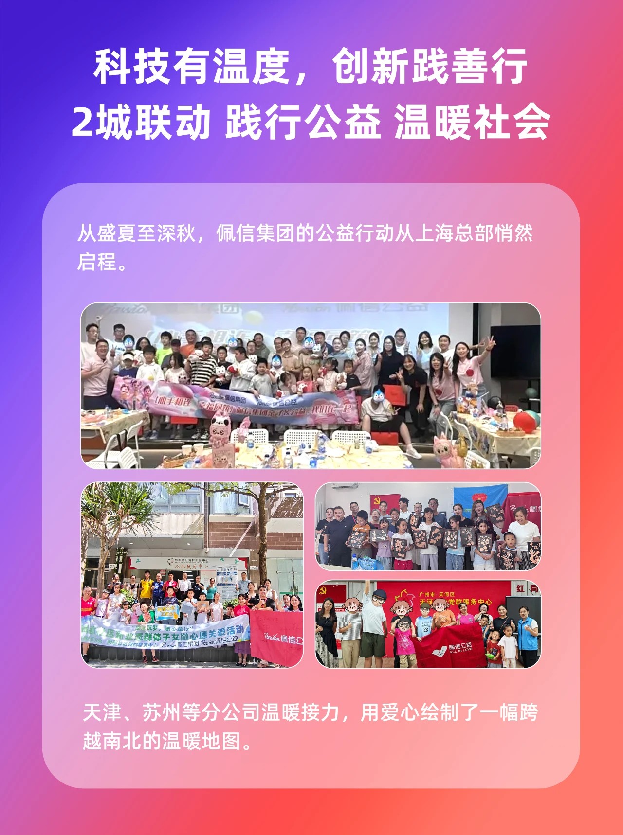 从2025年夏天开始,佩信陆续在上海、北京、广州、深圳、天津、苏州六地同步开展差异化公益实践:上海聚焦特殊儿童家庭的手工协作,北京联合街道残联开展艺术疗愈活动,广州推行“1+7”家庭结对模式建立长期陪伴关系,深圳回应新业态劳动者子女的微心愿,天津通过助农礼包支持困难家庭过节,苏州精准帮扶困难学子……