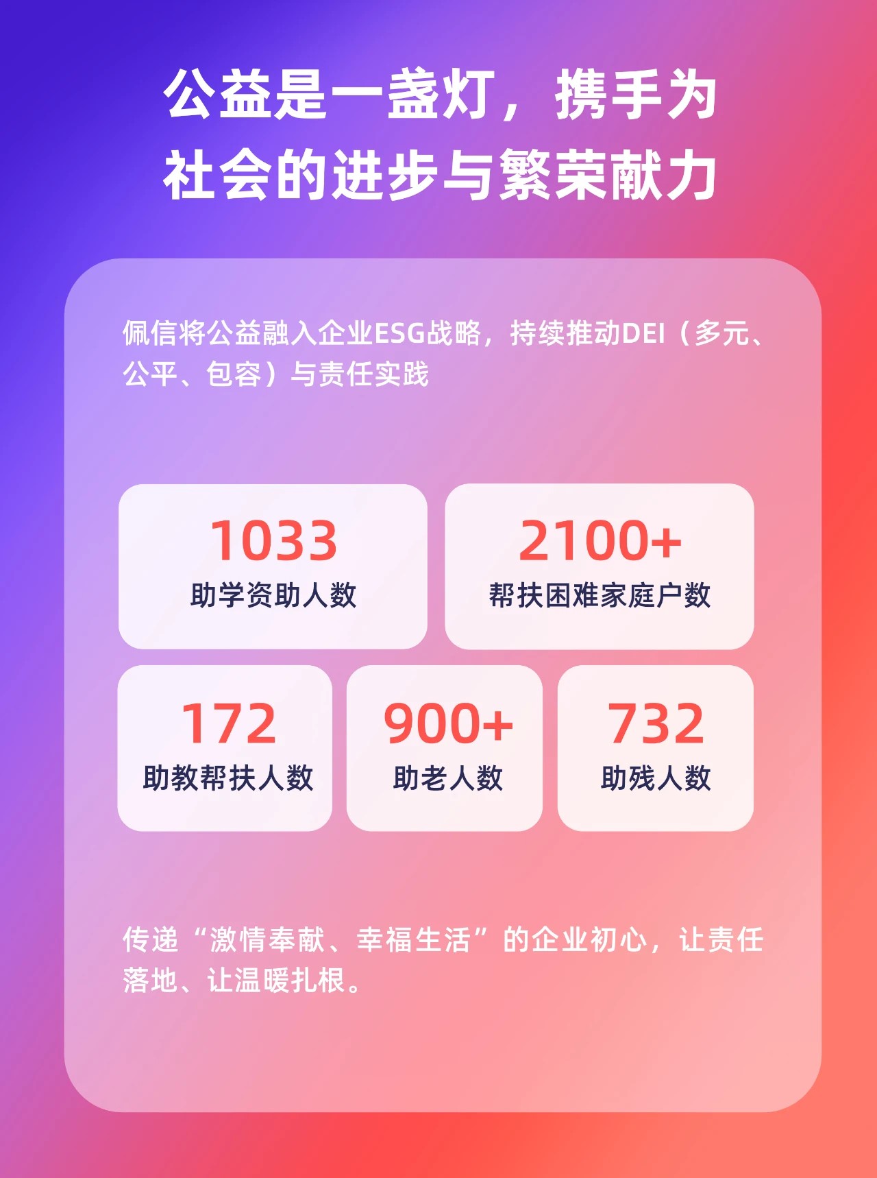截至2025年6月,佩信集团累计资助学生1033人,帮扶困难家庭超2100+户,并在历次重大公共事件中持续响应。但比数字更值得关注的,是佩信在公益行动背后的方法论:如何让善意在组织内部沉淀为文化,在外部延展为生态,并最终回归到人的全面发展。